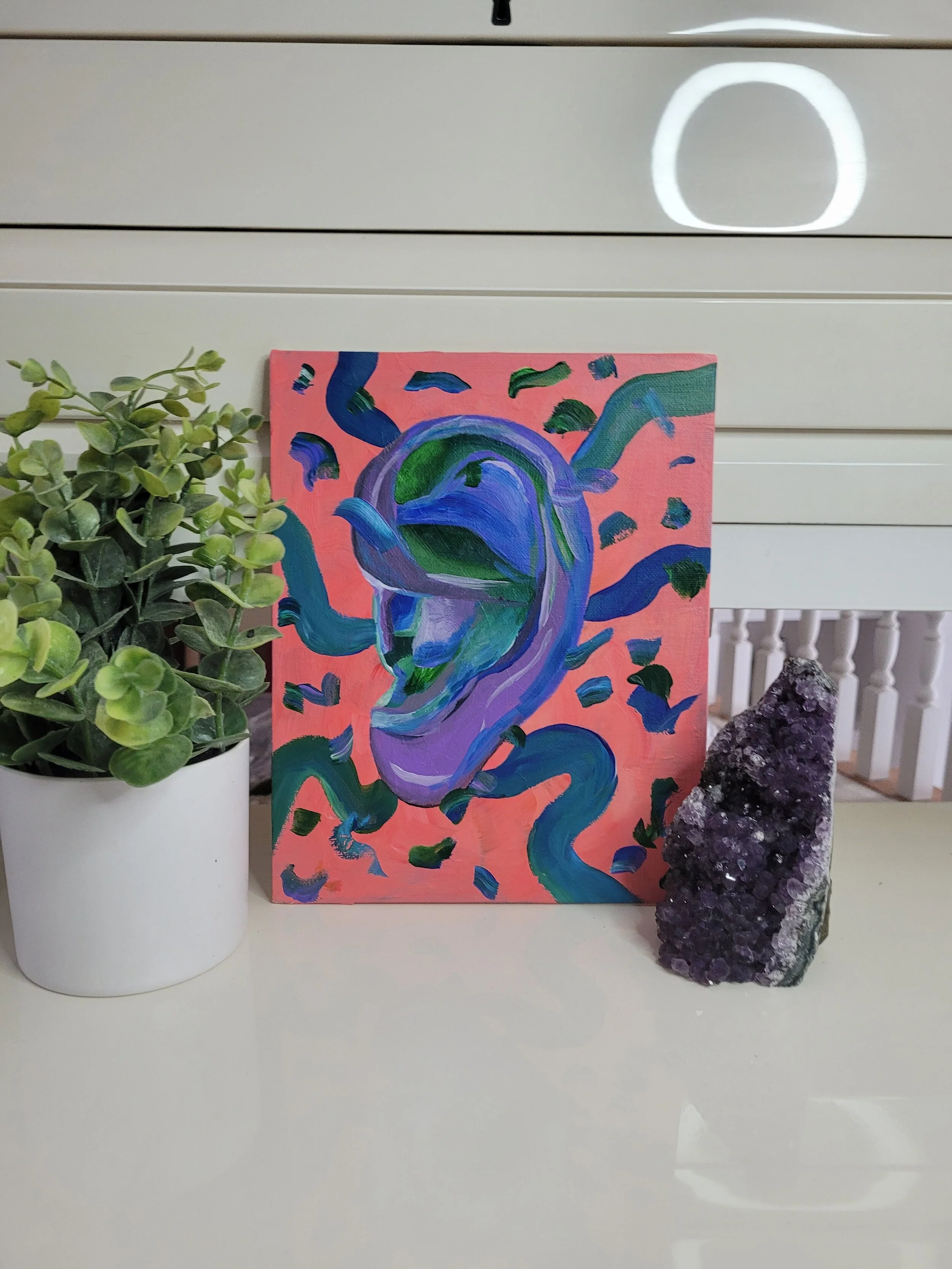 Image 1 of 1 Listen Sale Price: $31.50 Original Price: $45.00 8"x5” acrylic painting done on a canvas board. Colorful ear representing the connection to our hearing sense. Quantity: Add To Cart Added! 8"x5” acrylic painting done on a canvas board. Colorful ear representing the connection to our hearing sense.